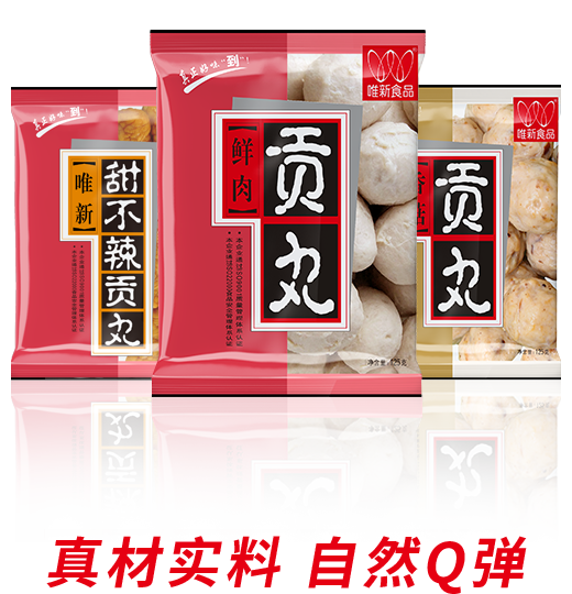 選擇蛋白質含量及新鮮度高的豬后腿肉為原料,模擬手工捶打的打漿工藝,再經煮制、冷卻、速凍工藝才可生產出自然脆彈的唯新貢丸,是居家佐餐、火鍋的美味食品。近年來我們還研發(fā)生產了香腸、蝦滑、魚丸、牛肉丸等大眾喜愛的家庭火鍋料速凍食品。